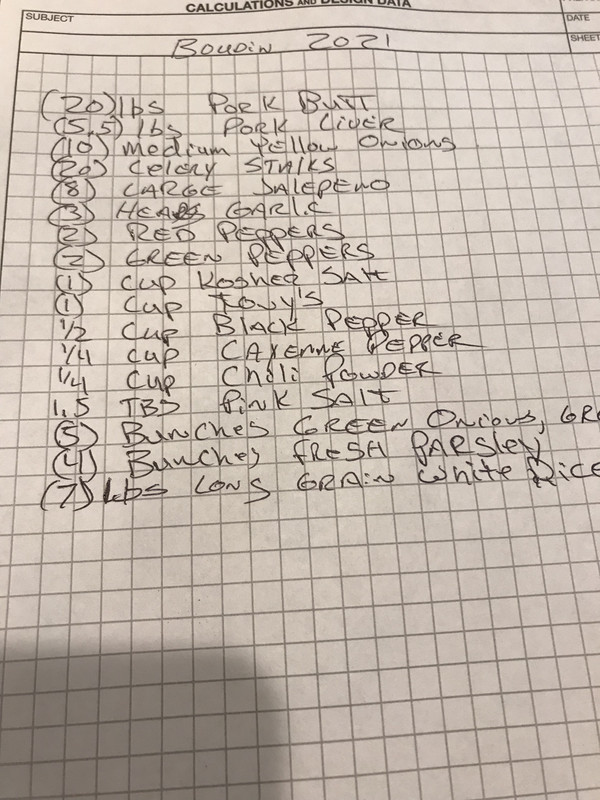 Here’s my hen scratch if you can read it. This was my base for the initial cooking down, minus the rice of course. I also threw in a few bay leaves. After the rice, meat and all were mixed I added a little more Cayenne, black pepper, garlic powder and salt to taste. I also added a few glugs of Redboat fish sauce, because why not. The liberties of not being a real coonass. The casing were 32-35 natural casing. This is close to the framework and f Donald Link’s recipe. I’ve made a batch for the last 6 years and have tweaked a little each year. This is my best batch. A big reason is because I finally got a stuffer and quit chopping my rice up trying to stuff links with a grinder and making it too mushy. It’s fun. Before I die I’m going to have a recipe better than Billy’s, Best Stop or one of them. Or drink a lot of beer trying