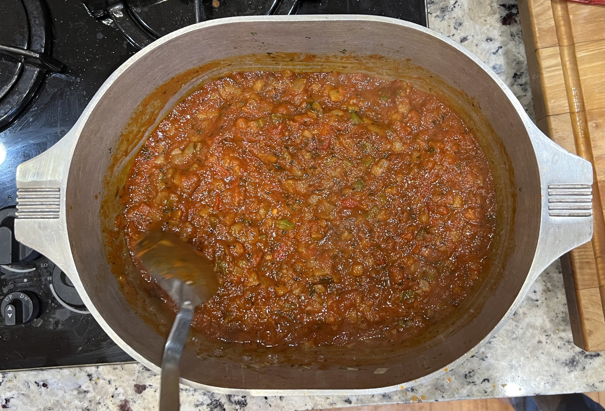 About 30 rolls with seasoned ground beef/pork in an 18 inch oval roaster. And the red gravy to pour over it.