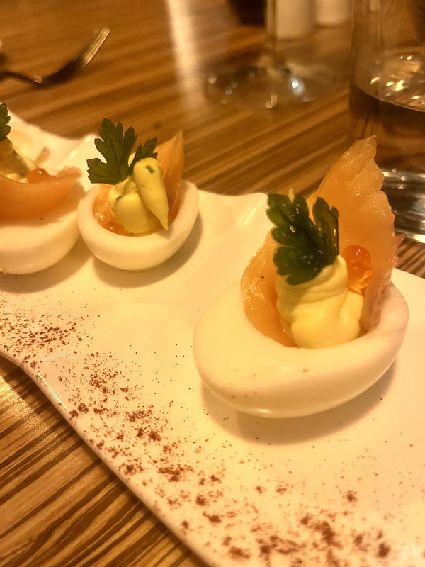 Our next dinner may have been the highlight of the trip. We ran into a neighbor on the beach who recommended this place. It’s a restaurant called Ovide inside the Hotel Effie in the Bay Towne area. We started with a Caesar salad topped with white anchovies and Smoked Salmon Deviled Eggs.