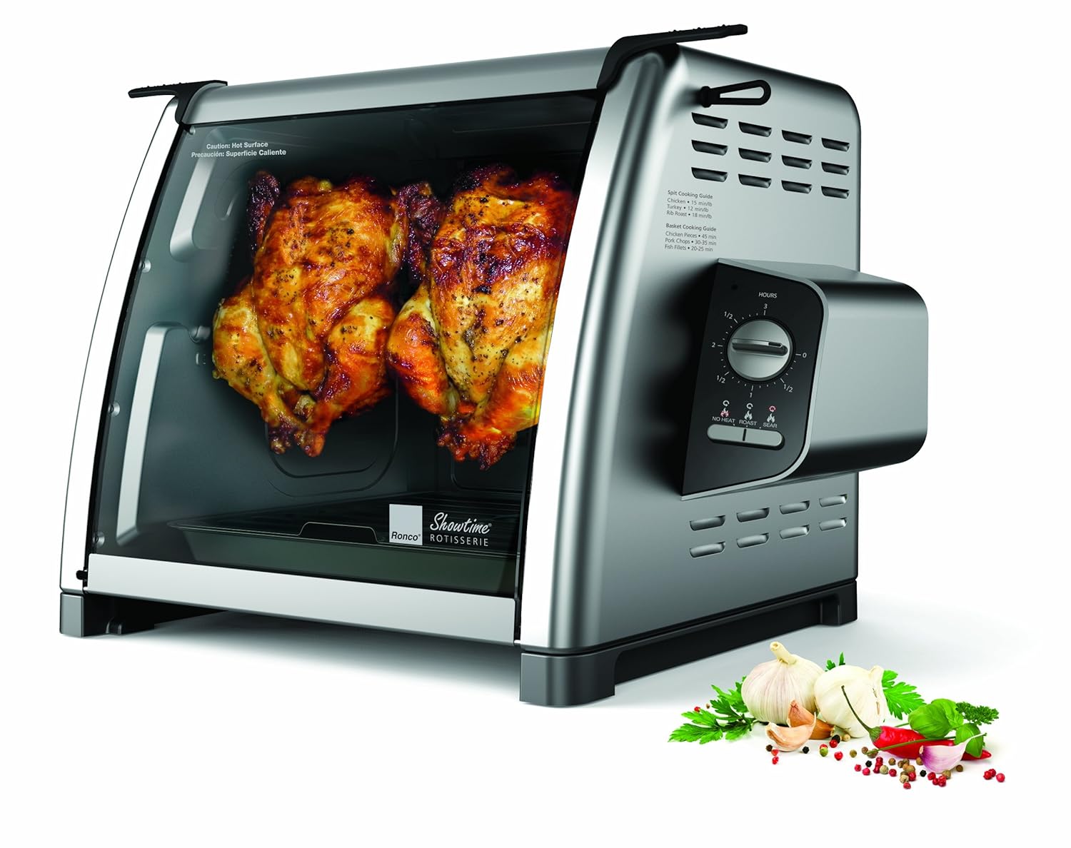 We have one we inherited from my in-laws when they moved. I've cooked pork roasts, chickens, and small turkeys in it and they all came out awesome. Turkeys have to be under 12 lbs--10 lbs fit better but it's hard to find whole turkeys that small. While I do occasionally pick up a pre-made rotisserie chicken from Costco or Sam's, I always feel like those birds have way too much sodium to be that healthy. Seasoning/cooking them myself I can control that a lot better.