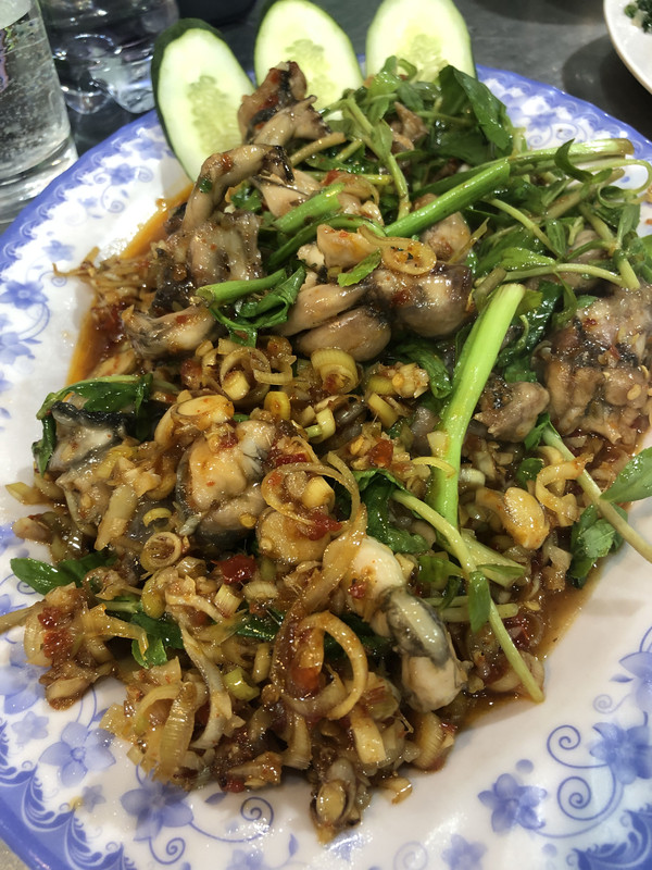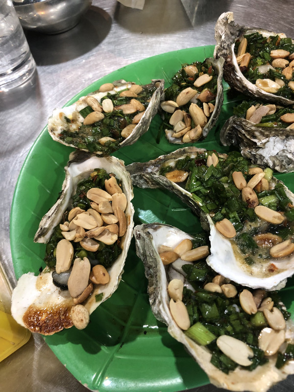 Grilled oysters with bacon grease, green onions, topped with peanuts(I know it sounds weird)