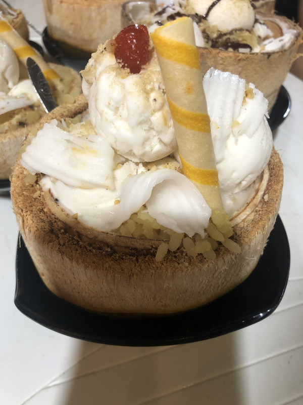 5 scoops ice creams in a coconut bowl with coconut jelly, freshly grated coconut meat, sticky rice, crushed peanuts, cookie stick, and topped with candied Malaysian gooseberry. Very good that I ate 2 bowls. 30k($1.20)