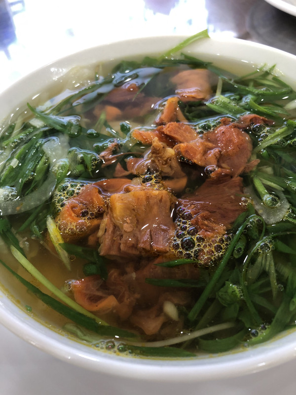 Had a random noodle soup. Dish is from the Hanoi. Contains noodles, broth, braised beef and tendon. Very mid.