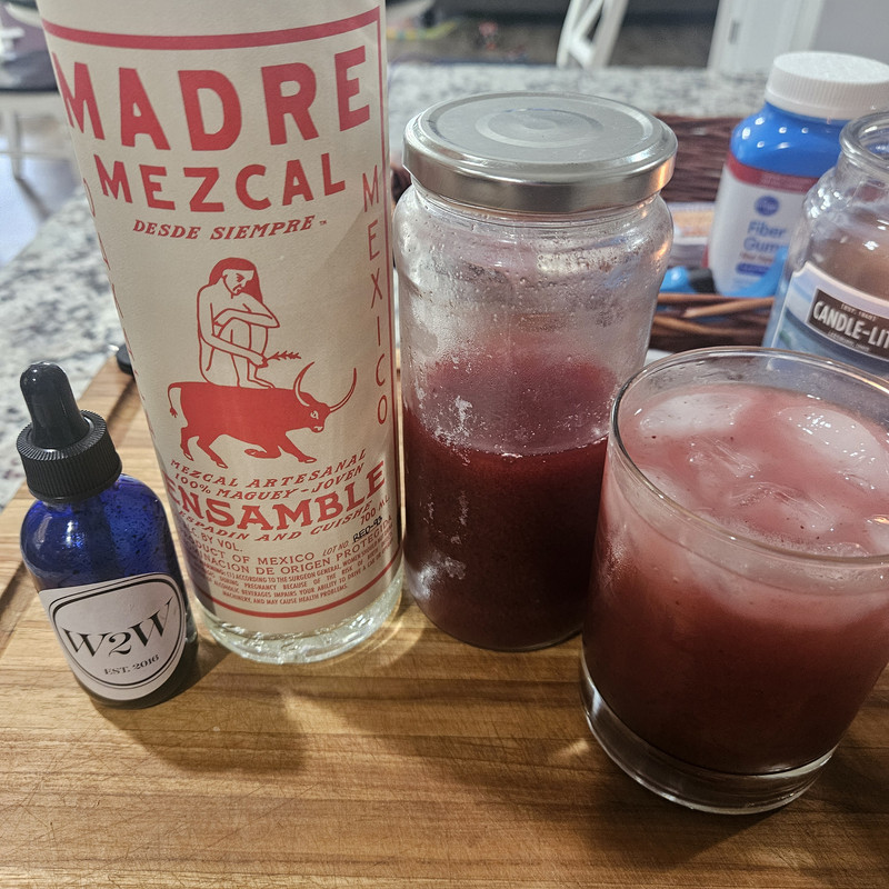 Mezcal, blackberry simple syrup (zero sugar), local bitters. Over ice.