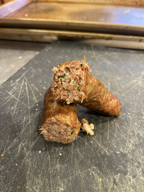 Wanted to give this a try since getting a sausage stuffer a few months ago, I loosely followed Donald Links recipe. I also used chicken liver, and while the end product is good I will use pork liver on the next round. I'm still on the hunt for a big meat grinder, the one on my Kitchenaid just works ok, so I put all the meat into a bowl and ran it in the Kitchenaid mixer for a while with a paddle and it ends up like finely shredded pork.