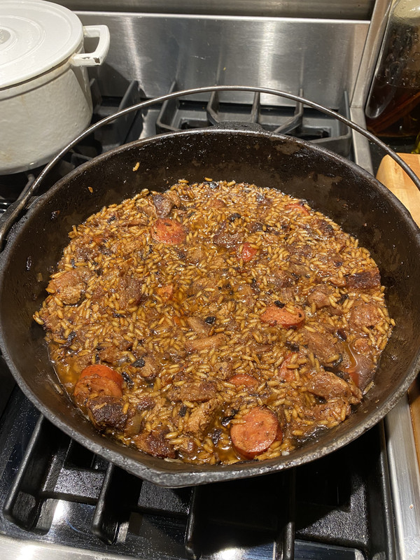 Really easy, I cut up what I thought would be enough pork Boston butt into 1” cubes, browned them well, 2 cups chopped yellow onions, 1 cup bell pepper, 1 cup chopped celery, 2 heaping tbs “jarlick”, 3 links Savoie’s smoked pork sausage, sliced, 2 cups Parish rice, 3 cups chicken stock.