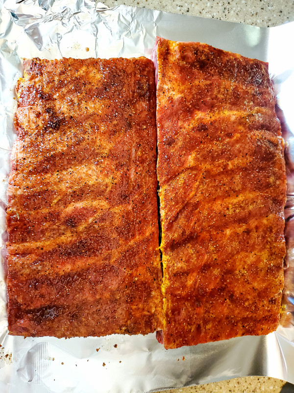 I went 250 for 2 hours spraying with apple juice/water mix every 30 minutes. Wrapped in foil with butter, brown sugar, honey mix on the foil meat side down. Let cook another hour and a half. Let rest for 15 minutes then glazed then put back on for 15 more minutes and then cut em up.
