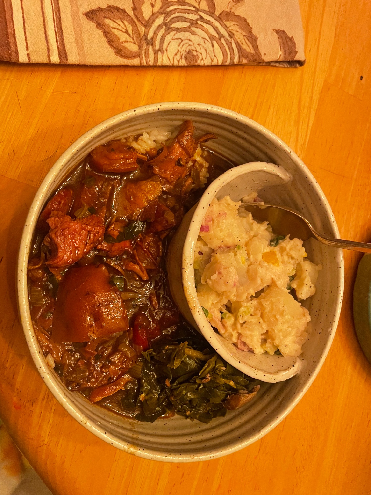 My smoked turkey and andouille gumbo. I use the carcass for stock, and I simmer it down with some allspice, cloves, garlic, onion, salt and peppercorns. I do grate some nutmeg on the final product when I add my file. I love the way those fall spices pair with turkey.