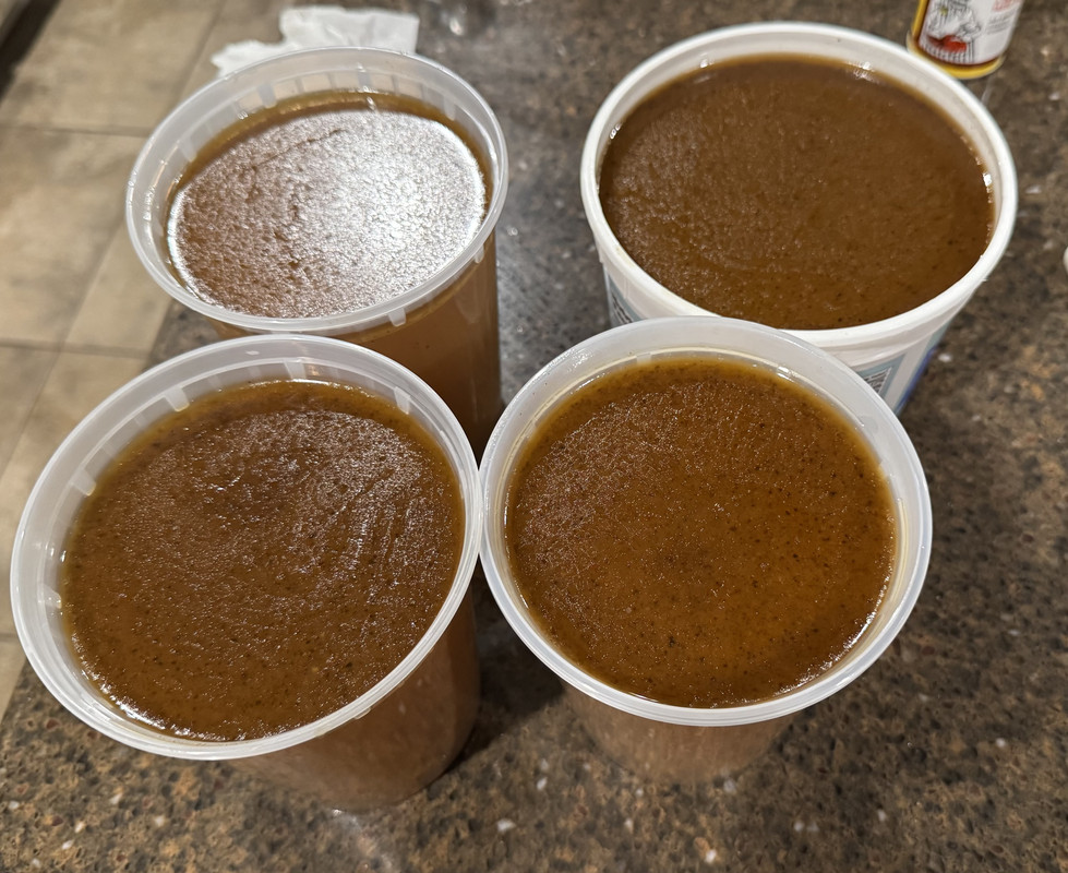6 qts of rich broth from 5 chickens and a smoked turkey. About 8 hours cooking and 90 minutes cooling/straining. Tastes delicious!