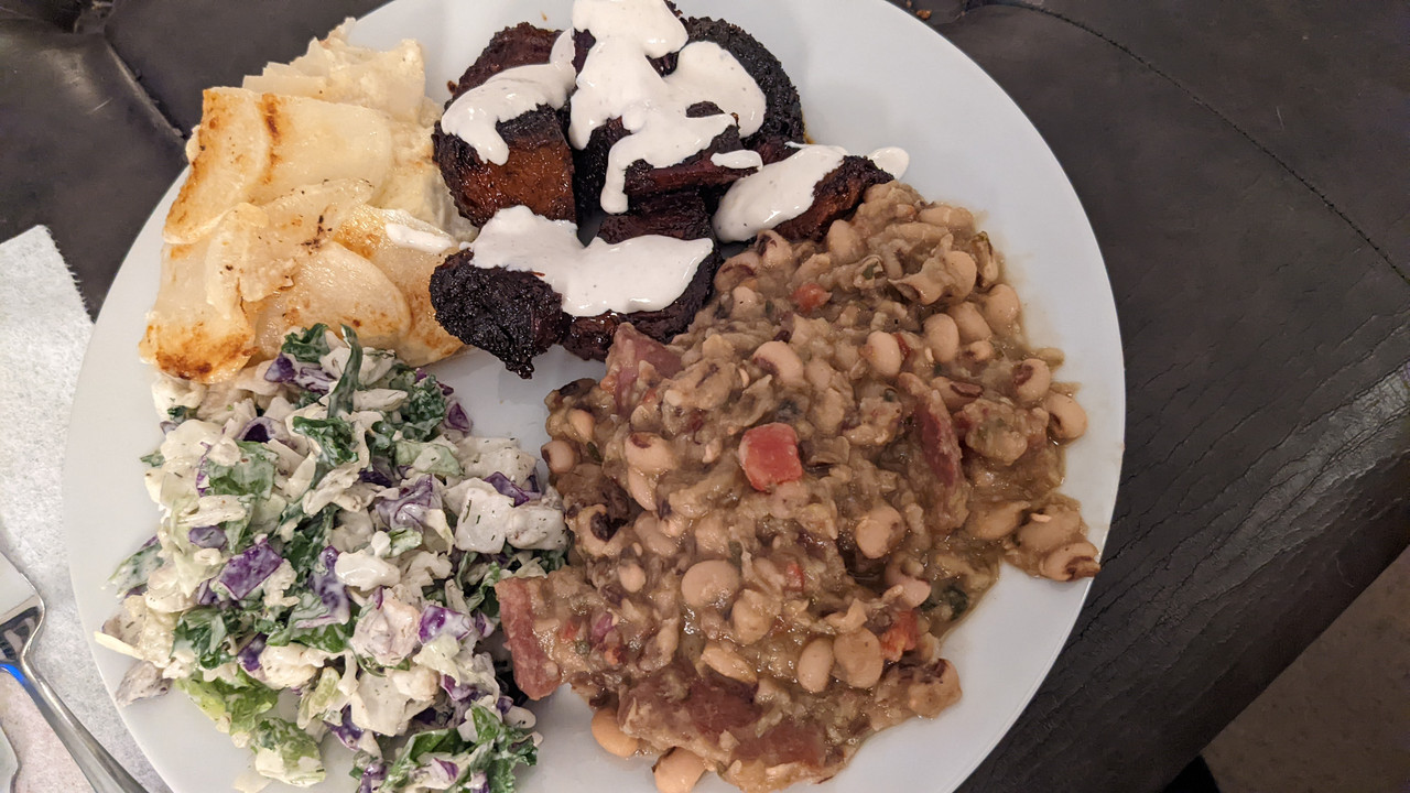 Pork roast, big white limas, rice, mashed potatoes, gravy, salad and rolls. Got them fed, my bartender, too. :)