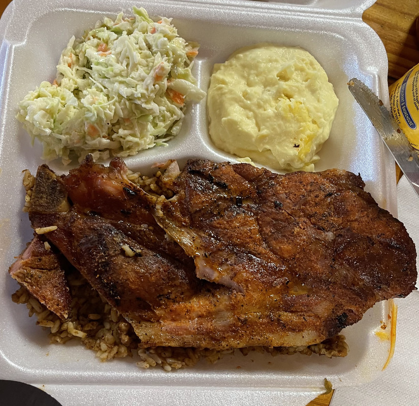 BBQ chicken and BBQ pork steak. Lots of food. Brought half of it home.