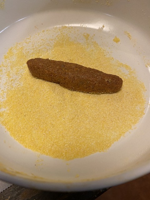 Also, I was skeptical that a roll in corn meal would be enough to make a good corn meal/masa layer and flavor. So I rolled the “logs” once, and then spritzed with water and rolled again. Edit: I skipped this on the next batch. Not necessary.