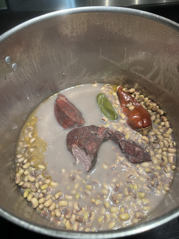 So I called an audible on the peas, and cooked them with some tasso I also bought from the Mowata. It is excellent. I also added a jalapeno I grew, as well as a chile off my ristra. The tasso is excellent, great smoked flavor combined with the peas. Good meal to watch first half of Saints game. Who dat! Fyi I have the tongue slow cooking in the oven with some locally grown squash and that will be supper.