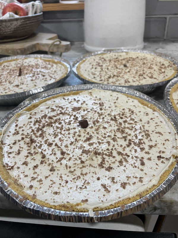 I think the pie crusts I got must have been bigger. This recipe would not have made 2 pies worth, so I just made one REALLY FULL pie. Chopped up 4 peanut butter cups, into the freezer. Really excited about this for tomorrow.
