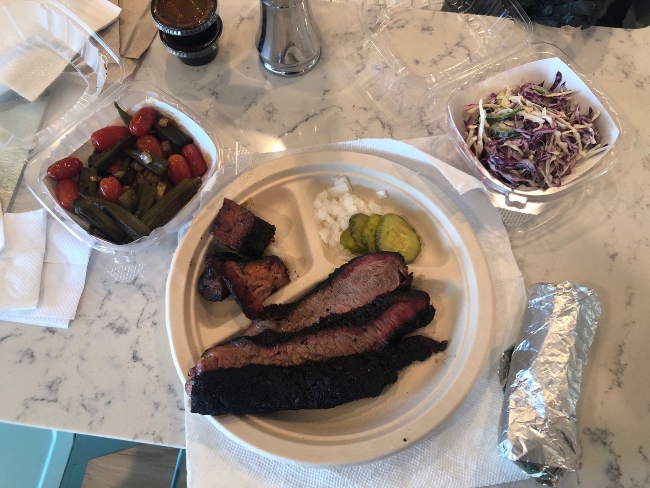 Rollin Smoke is no joke. Ordered brisket, pork belly burnt ends, pulled pork taco along with spicy slaw and smoked okra. It was all fantastic. Very classic. They have lots more than their online menu shows. It's in a food truck park with parking and plenty of shaded tables if you want to eat there.