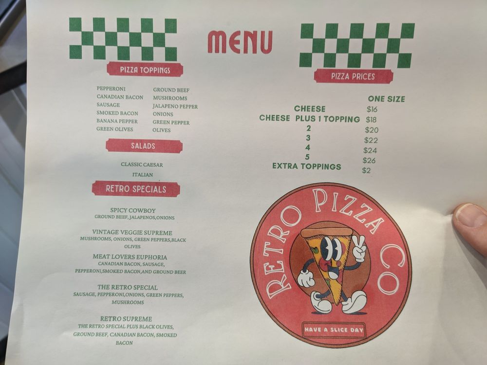 More details. What makes it retro? What kind of crust? Kind of sauce? Toppings quality? How they cook it?