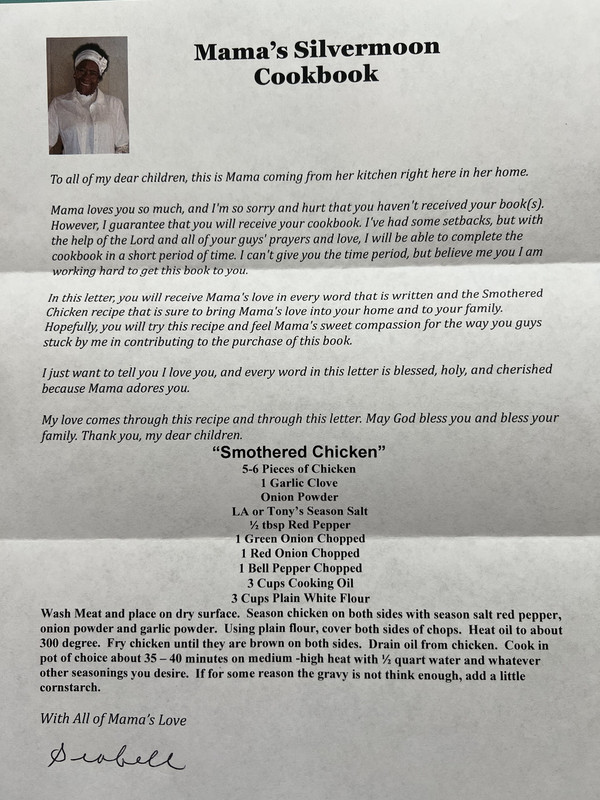 Maybe Mama didn't write down her recipes? It doesn't sound like she's the one pushing to get a cookbook published. It seems like a friend or family member that's looking for easy money.