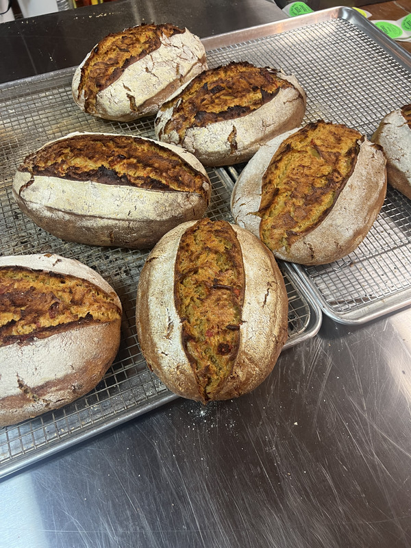 Will have a scratch and dent sale on these whole grain sun dried tomatoes, Parmesan and pesto loaves tomorrow. Kind of flattish. Taste great.