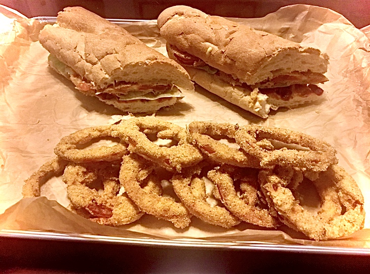 Fried tomato, lettuce and bacon poboy, with a side of fried tomato rings