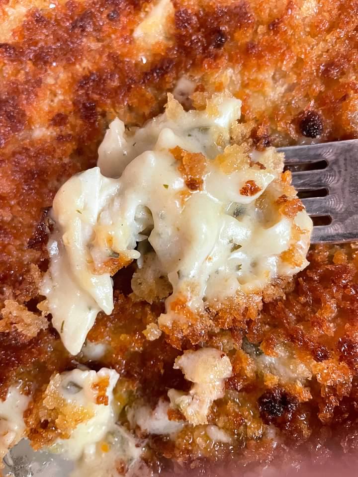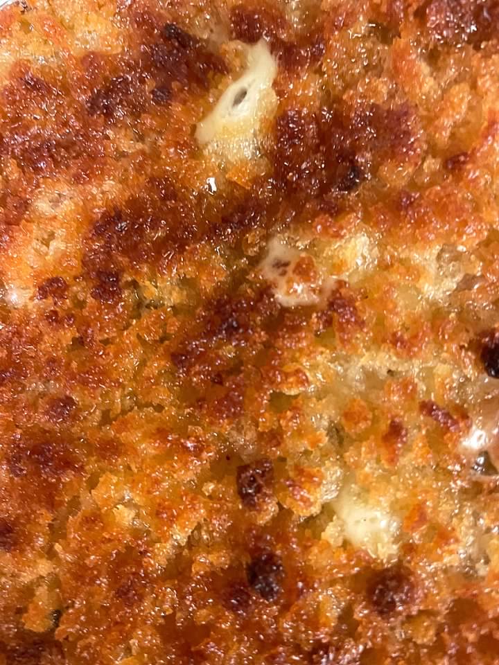 1 C panko (preferred) or bread crumbs, tossed in melted butter-about 3 T or so. (I love the crunchy toasted panko texture with the creamy sauce.)