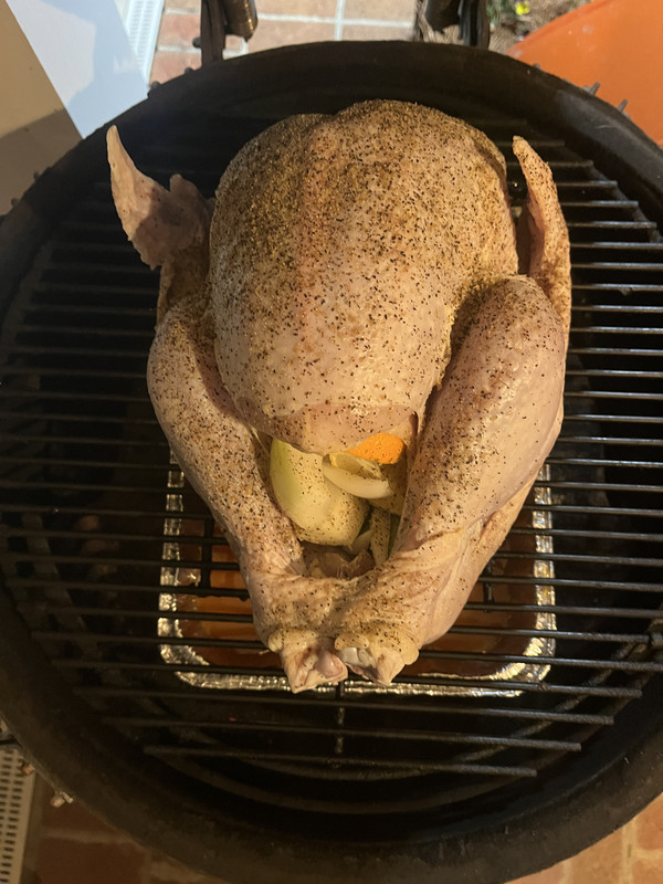 Got the KJ lit and about to put the bird on 14lb smoking her with hickory and sugar cane. 24 hour wet brine with granulated sugar and salt. Will be ready for lunch