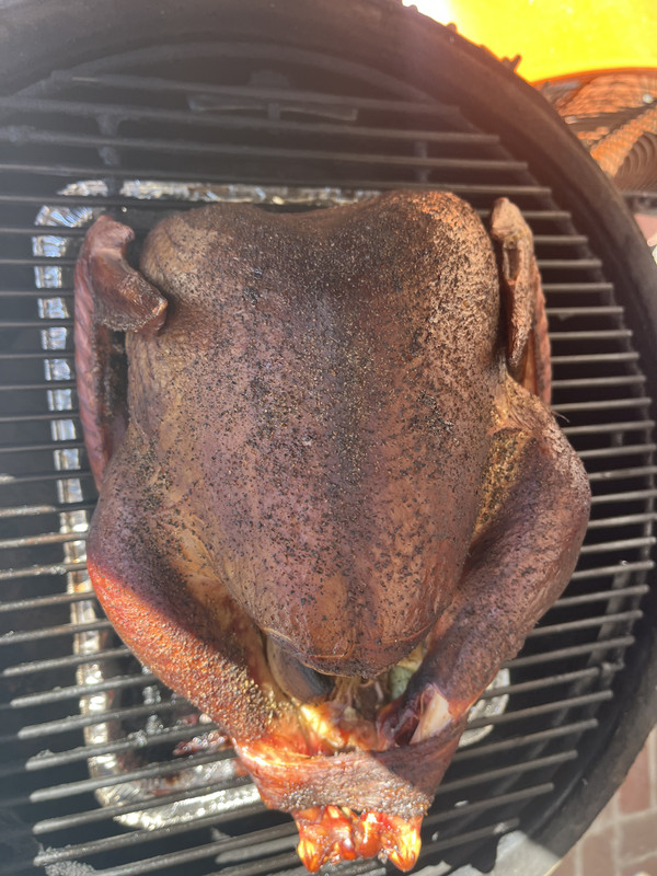 Spatchcocked and dry brined a 14 lb turkey yesterday. Put it on the Weber Searwood pellet grill armed with Smokin’ Pecan pellets at 6:00 this morning. Set at 325, but it always cooks a little lower than the control panel says.