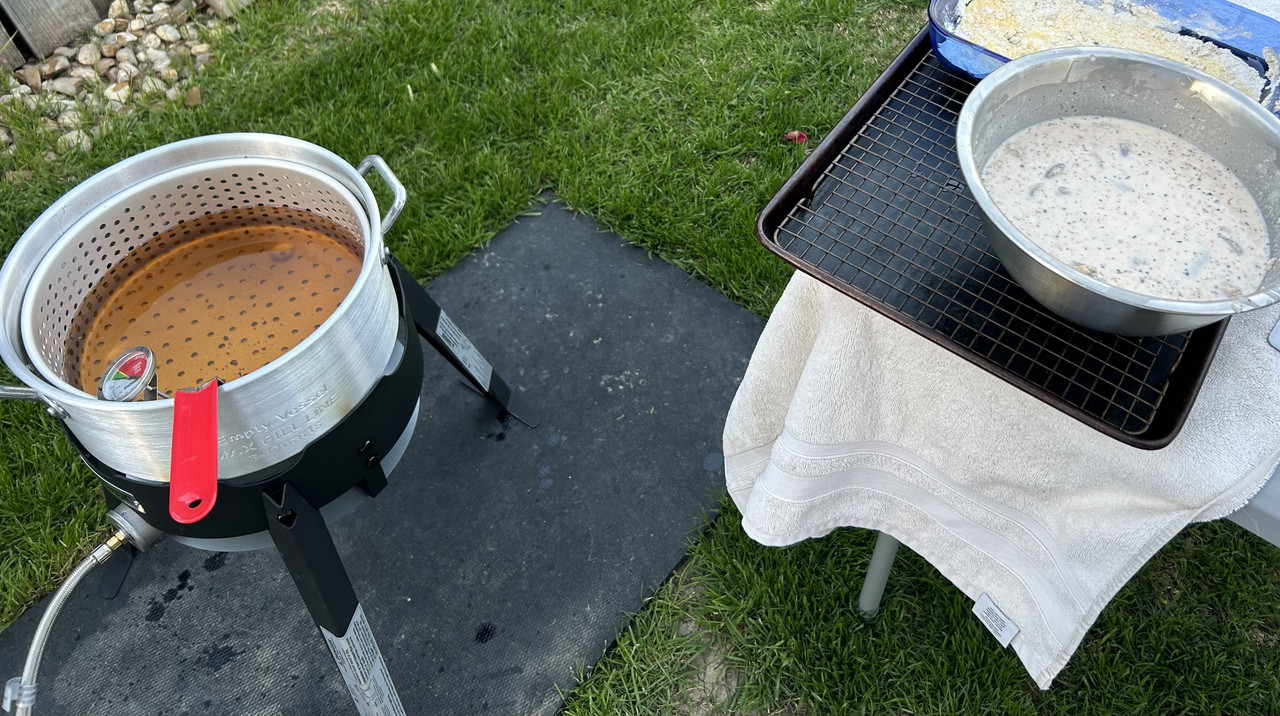 Update: Catfish, shrimp, hush puppies, fries all came out great! Temp is a bit of a challenge but I got a rhythm going.