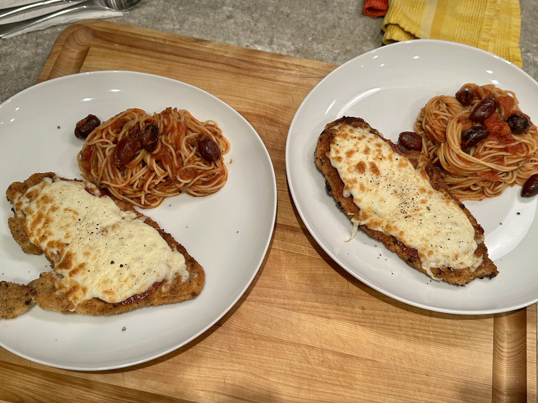 Chicken Parm pasta w/kalamatas. Snuck some basil & pepperoni under the cheese