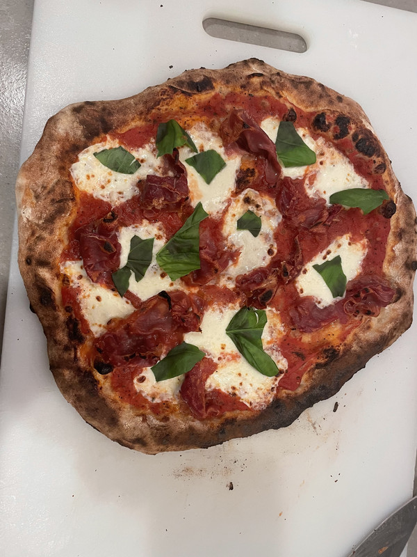 First pie in the Ooni this year. I like a little char. Simple - basil and prosciutto