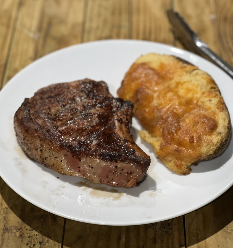 Thick pork chop and stuffed 'tater