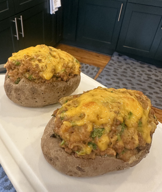 Sauteed mushrooms, asparagus, twice twice-baked potato.