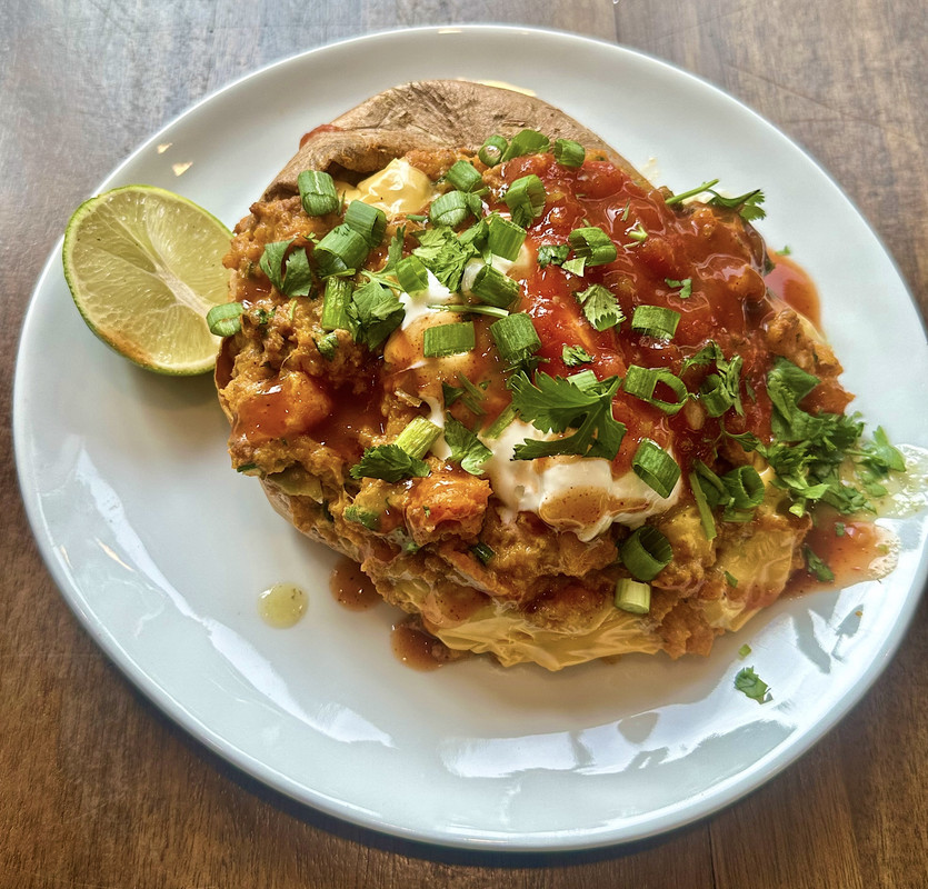 Sauteed mushrooms, asparagus, twice twice-baked potato.