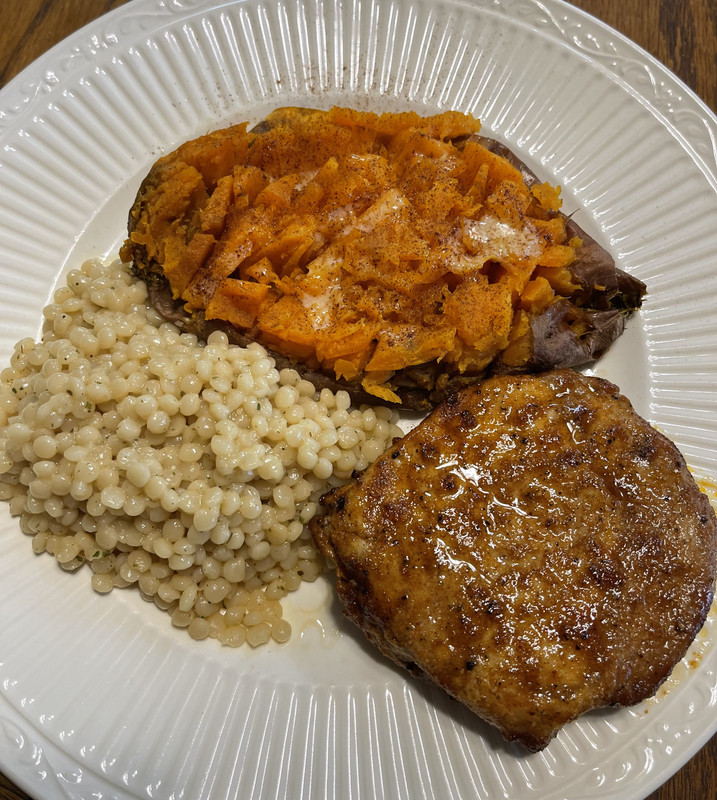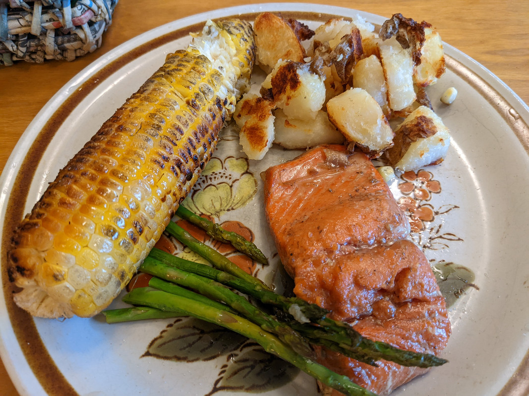 Bacon sausage patty burger (left over from bacon challenge) and crawfish boil potato salad.