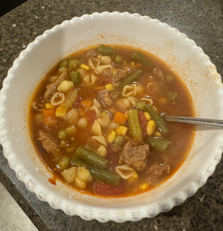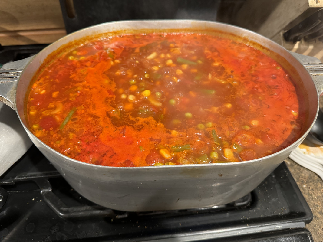 Beef vegetable soup, cooked in my wife’s grandmother’s vintage Magnalite.