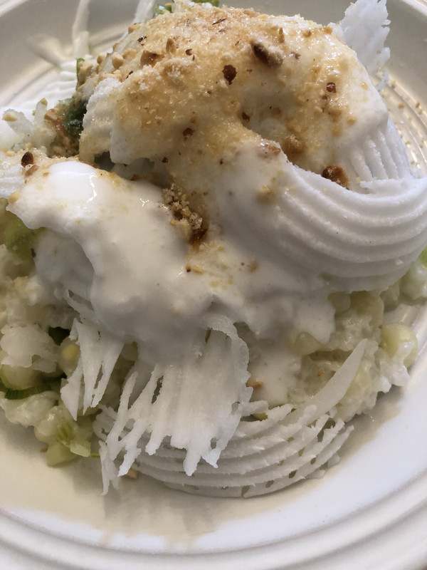 Baked chicken, mashed potatoes, green peas and fake crab salad. :)