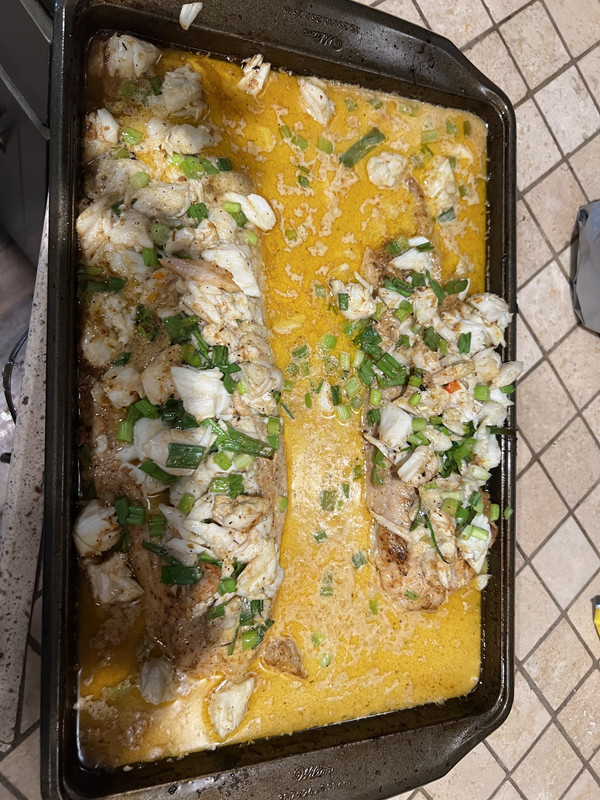 Baked fish with lemon butter cream sauce topped with jumbo lump crab