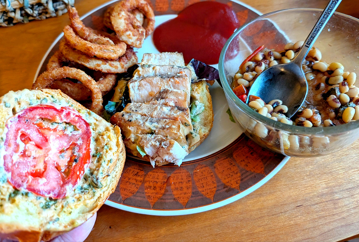 Grilled swordfish burger with a lemon herb wasabi aioli and purple cow peas from the garden