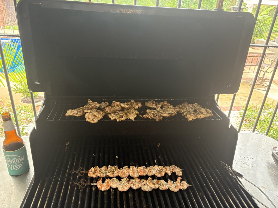 Greek + Cajun infused shrimp kabobs and chicken thighs. Which means Cavenders AND Slap your Mama. House made red pepper hummus, bourbon whiskey