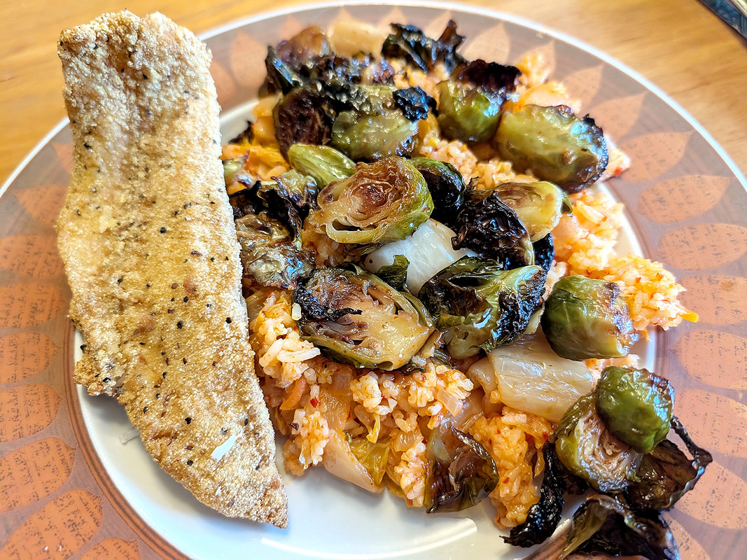 Kimchi fried rice with thai chilie roasted Brussels and a piece of leftover fried catfish