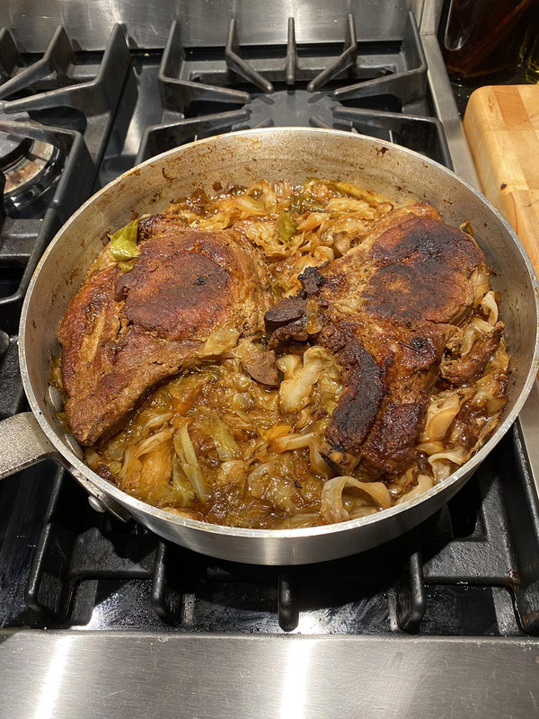 Fried pork cutlets (pounded thin schnitzel style) on buns with kimchi and likely kewpie mayo and maybe sriracha. Fries or tater tots, not sure what treasure the freezer holds.