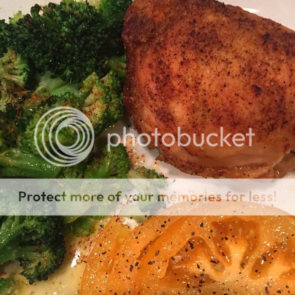 Baked chicken thighs, broccoli, heirloom tomatoes.