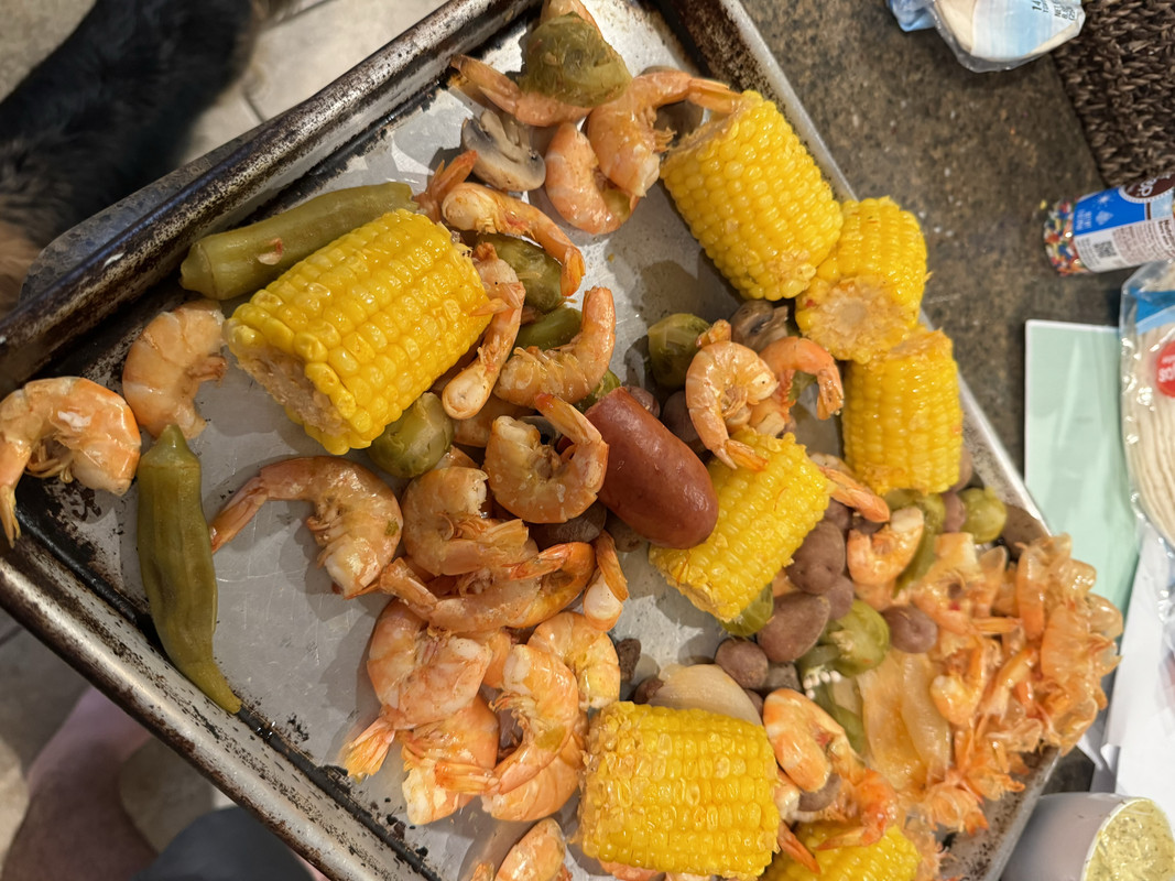 Shrimp boil- corn, mushrooms, Brussels, okra, sausage and the perfect bite sized potatoes. Homemade tartar sauce with plenty of dill to dip in, too.