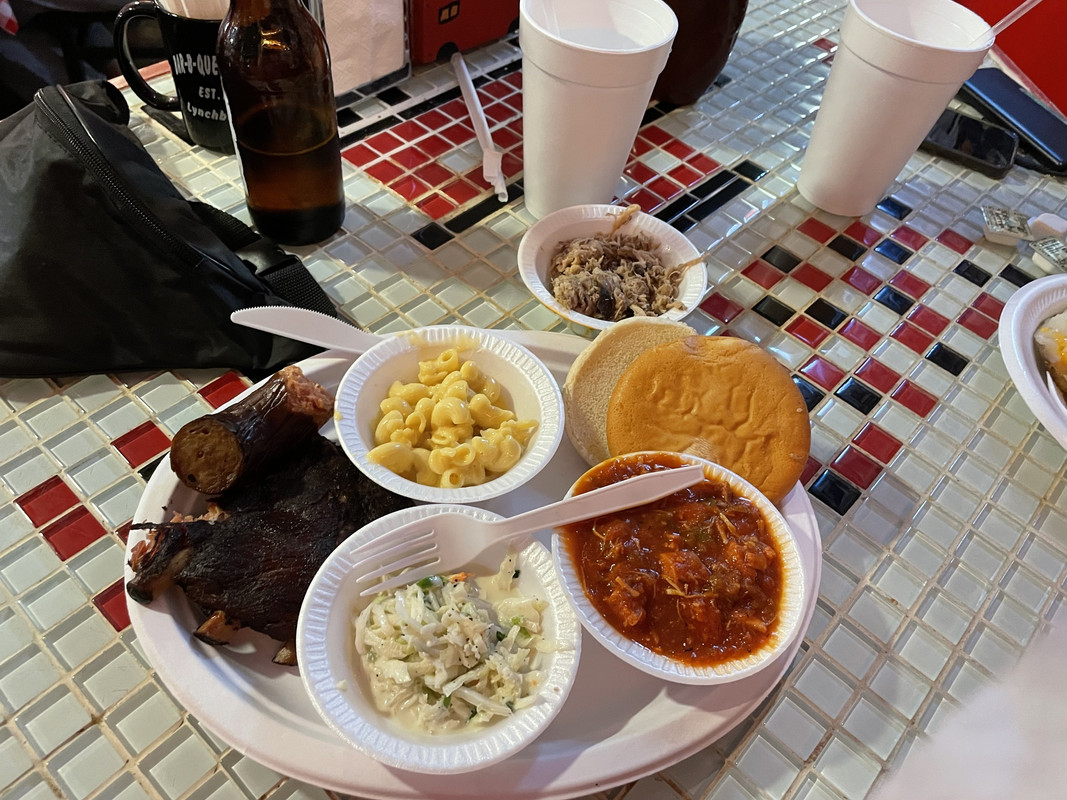 BBQ Caboose in Lynchburg had tasty ribs and brisket. Their jambalaya was not like most in Louisiana but tasty.