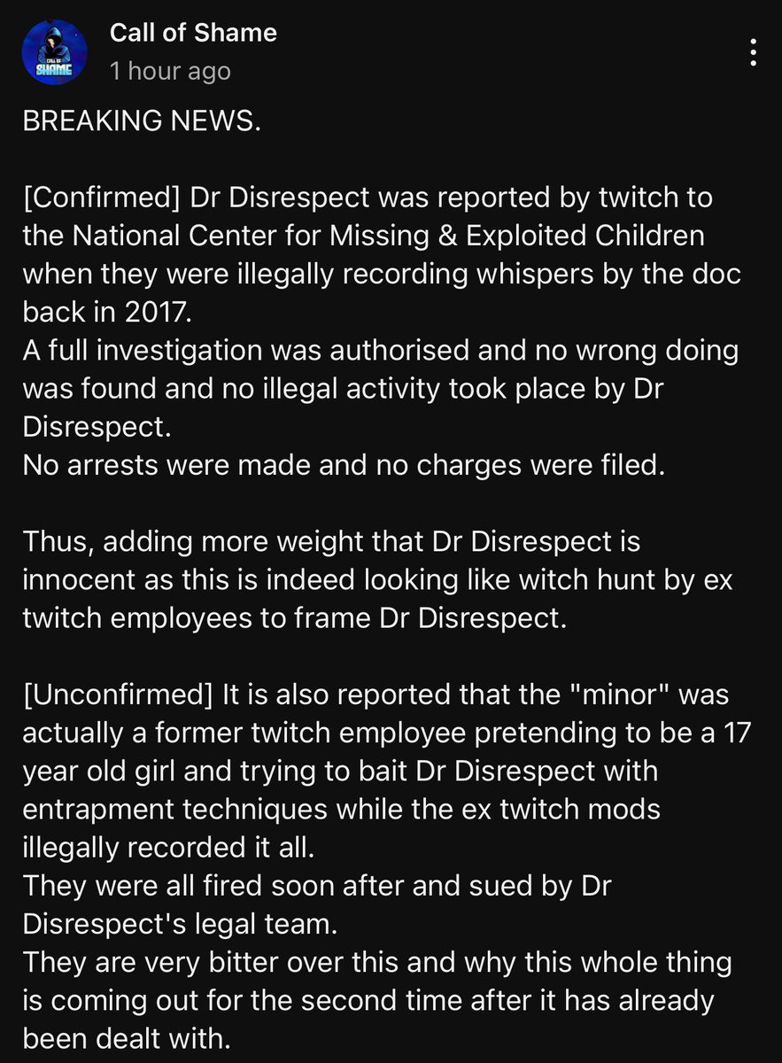 Dr Disrespect was now confirmed in an article by @Slasher in the @RollingStone to have 1) "sent sexually graphic messages to a minor he knew to be underage"