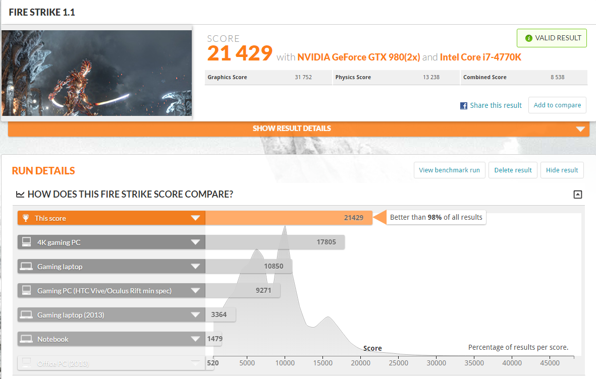 My rig is dated TBH. The SLI 980s score better than a 1080, but I'd rather a single 1080 without question. Back when I was altcoin mining, I had 3 AMD Tahiti GPUs in one rig and got a pretty similar 3dmark score, but it was shite for gaming.