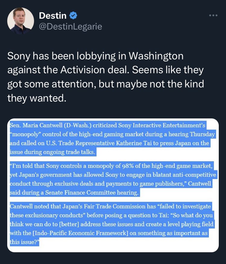 In other news, a Democrat Senator from Washington was questioning Sony's relationship to the Japanese government in a hearing yesterday. Sony has really made a HUGE error with the way they've handled this, because there was never any legitimate reason for them to oppose this acquisition. I honestly don't know why they would keep Jim Ryan if this results in more regulatory scrutiny for them in the USA. His childish antics have made them look like fools. Walking away from the bargaining table while everyone else signed 10-year deals with MS may turn out to be a historic blunder, especially if it resulted in regulators taking a closer look at Sony's third party exclusivity practices.