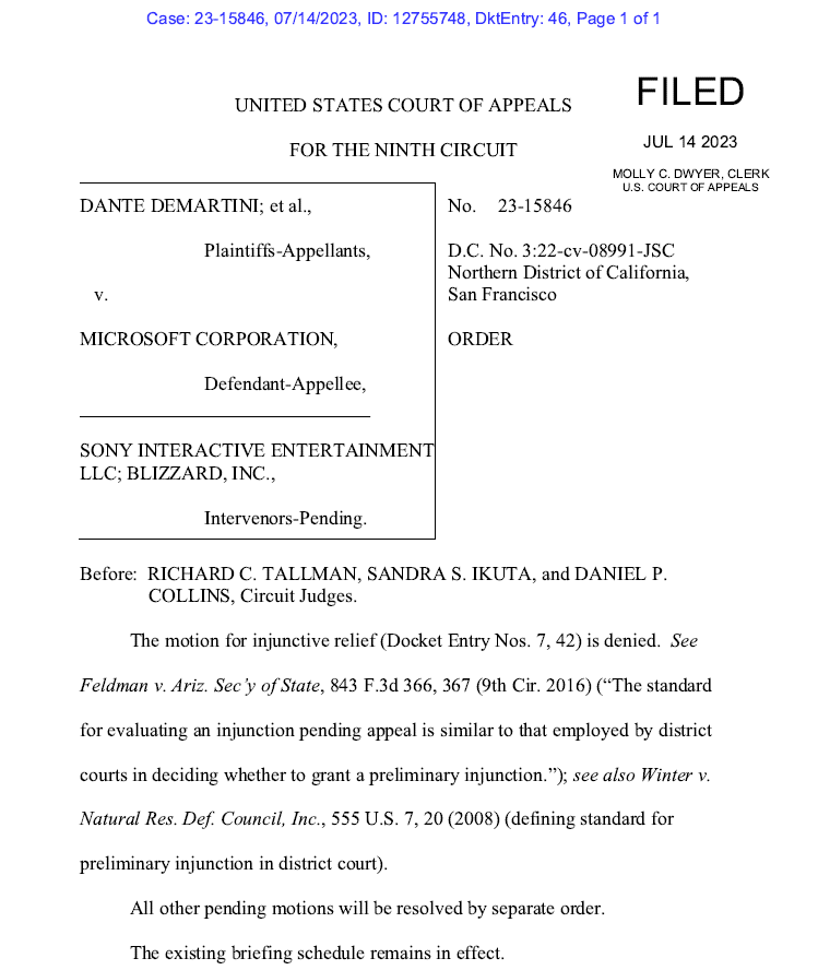 We appreciate the Ninth Circuit's swift response denying the FTC's motion to further delay the Activision deal. This brings us another step closer to the finish line in this marathon of global regulatory reviews.