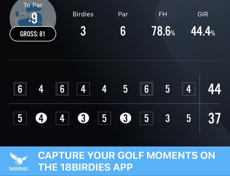 Only three real issues I had on the course were 2 chips that just hit soft spots leaving me real low chances of a make-able putt for par and I under-hit my 52 on an uphill shot on 18. Definitely my best GIR day of all time.