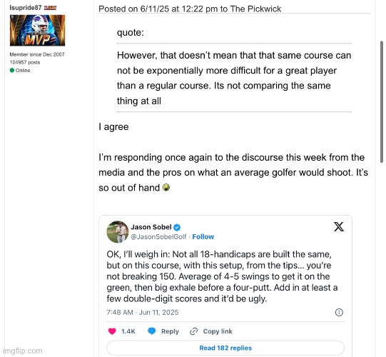 Jason lives in my neighborhood. He’s a single digit golfer, but also a “golf journalist.” The more drama/controversy, the better. 150 is a little much. Maybe?