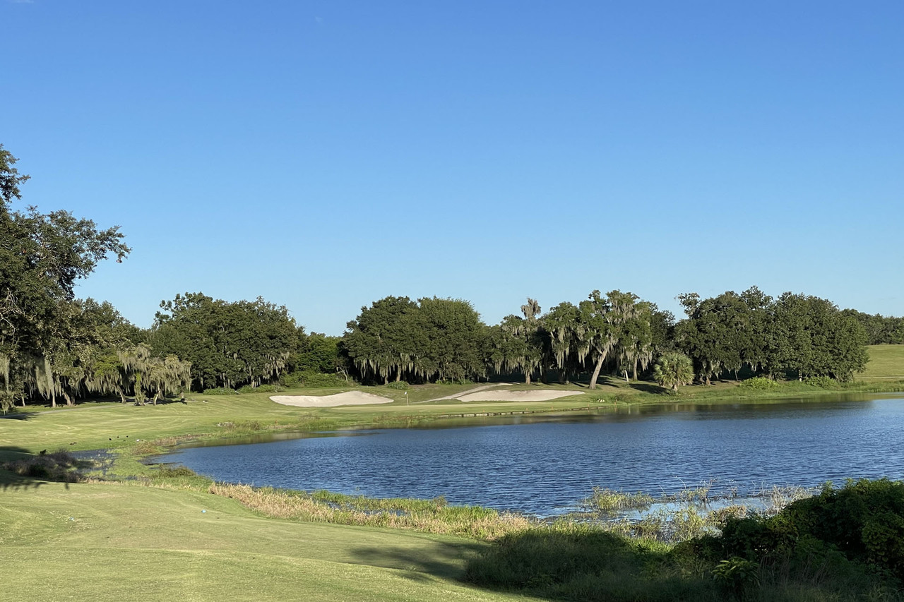 The signature hole does not exists any more. The last hurricane took out most of the trees behind the green (and on the course) and put the green under water and it was just now emerged from that lake. Believe it or not, the water was OVER those traps. It was a great hole. The new green is left and behind the original green. Just not as intimidating.